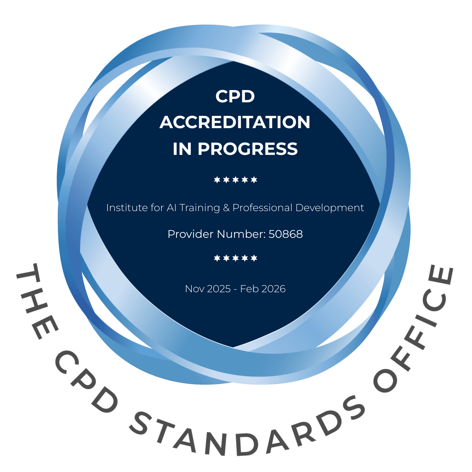 The Institute for AI Training & Professional Development (IATPD) is proud to announce that we have officially begun the certification process with The CPD Standards Office. We have been issued the CPD Accreditation In Progress badge and assigned Provider Number: 50868, with an expected accreditation window of Nov 2025 – Feb 2026.